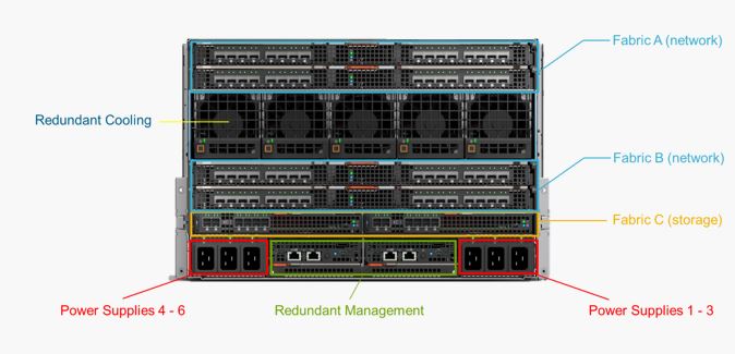כפי שפורט לעיל Fabric C הוא המיועד לטפל בחיבוריות לאיחסון ומציע יתירות (Redundancy) סלולה עם שתי מודולי I/O מסומנים כ- C1 ו C2.