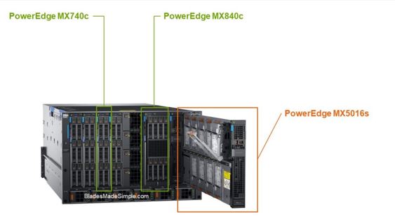 מארז PowerEdge MX5016s הוא להב אחסון (Storage Sled) בגובה מלא ורוחב יחיד התומך ב- 16 כוננים הניתנים לחיבור (SAS HDD SSD) האחסון ב- MX5016s יכול להיות משותף לכל השרתים במארז או להקצאה בחלקים לשרתים ספציפיים. הקישוריות תלויה בסוג כרטיס האחסון המותקן בשרת, לדוגמא אם נדרש שה- MX5016s יהיה משותף לכל המארז, השרתים הזקוקים לגישה יהיו מחוייבים להכיל SAS HBA. לחילופין, אם שרת זקוק לכמה כוננים מה- MX5016s, נדרש בקר RAID PERC בחריץ כרטיס האחסון שבשרת.