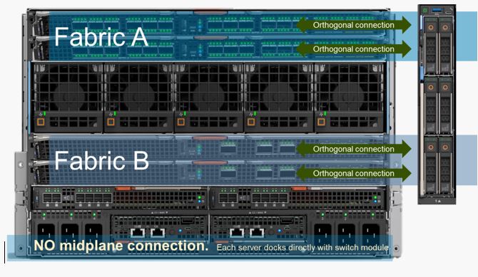 ארכיטקטורת ה- PowerEdge MX מספקת חיבור פיזי ישיר להעברת הקישוריות בין כל כרטיס רשת המותקן בשרת ישירות עם כל מודול I/O.