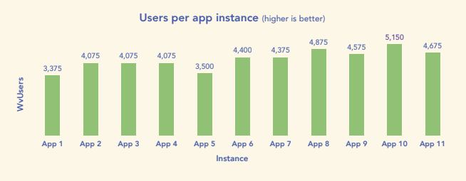 Weathervane מדווחת על מספרם המקסימלי של משתמשי Wv לכל מופע יישום. תרשים 1 מראה בכמה משתמשי Wv תמך כל אחד מ-11 המופעים שלנו.