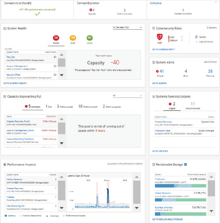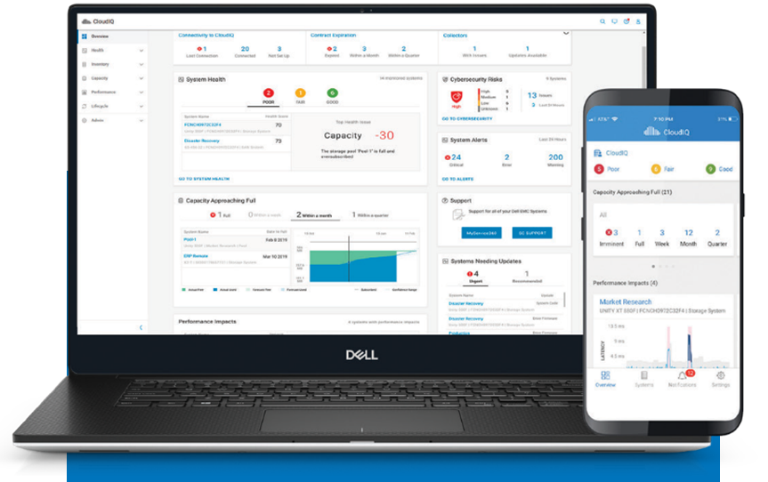 פורטל CloudIQ מציג את מערכות התשתית של Dell EMC בתצוגה אחת כדי לפשט את הניטור לכל רוחב הליבה, מרכזי נתונים משניים ומיקומי קצה כמו גם הגנה על הנתונים בעננים ציבוריים. בעזרת CloudIQ תוכלו להבטיח ביתר קלות שעומסי עבודה עסקיים קריטיים מקבלים את היכולת והביצועים שדרושים להם, להקדיש פחות זמן לניטור ופתרון תקלות ולהשקיע יותר זמן בחדשנות והתמקדות בפרויקטים שמוסיפים ערך חדש לעסק שלכם.