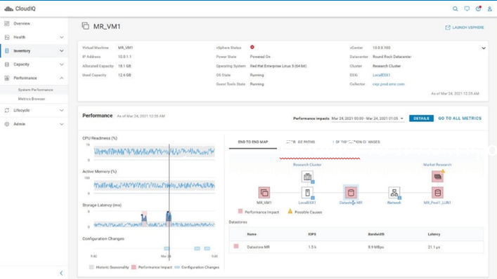 שילוב VMware: מספק פרטים על ביצועי VM בתוספת מיפוי מקצה לקצה וניתוח השפעת הביצועים על פני נתיב הנתונים: VM, מארח ESXi, אחסון נתונים, רשת ואחסון. מחווני הביצוע המרכזיים ושינויי התצורה מתואמים בזמן לשורש הבעיה.