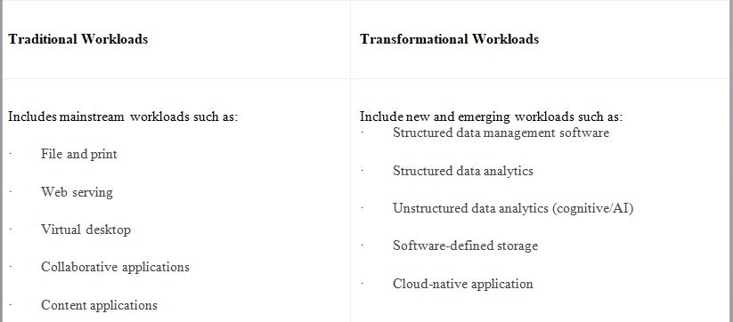 עומסי עבודה טרנספורמטיביים הכוללים עומסי עבודה חדשים ומתפתחים, הם בעלי דרישות חומרה שונות מאשר עומסי עבודה מסורתיים. (ראו הבדלים בטבלה מטה)